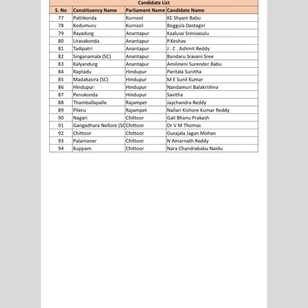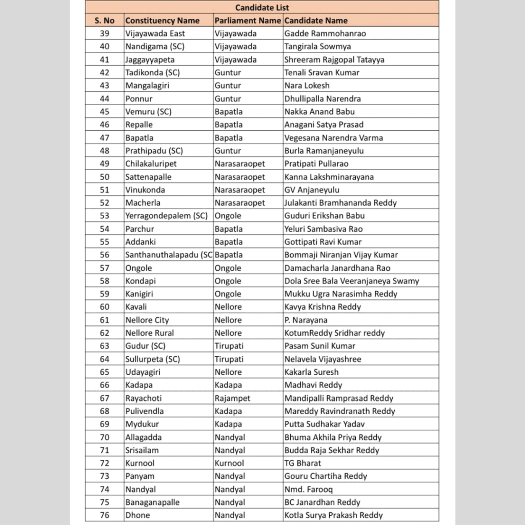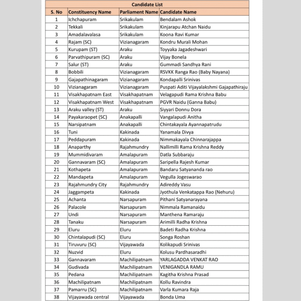 తొలి జాబితాలో భాగంగా తెలుగుదేశం పార్టీ 94 ఎమ్మెల్యే స్థానాల్లో, జనసేన 24 ఎమ్మెల్యే స్థానాలు, 3 ఎంపీ స్థానాల్లో పోటీ చేస్తుందని చంద్రబాబు ప్రకటించారు. కూటమిలో భాజపా చేరిక ఆధారంగా సీట్ల సర్దుబాటుపై రానున్న రోజుల్లో స్పష్టత వస్తుందన్నారు.
